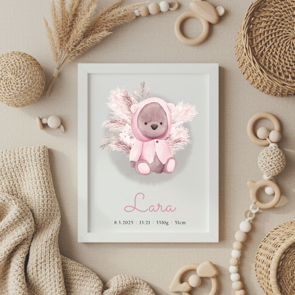 Prikupna grafika z rojstnimi podatki bo zagotovo lepa popestritev vsake otroške sobice, lahko pa je tudi krasno darilo za novopečeno mamico. Izdelek vsebuje grafiko z imenom in rojstnimi podatki v belem okvirju brez stekla. Grafika je unikatno oblikovana in prilagojena po meri, zato bo vaš dar resnično poseben. Nežno izbrani barvni toni in prikupni motivi ustvarijo toplino in čar, ki bo polepšal vsak kotiček otroške sobice. Grafiki lahko dodate tudi čestitko in darilni paketek za mamico in novorojenčka bo popoln.